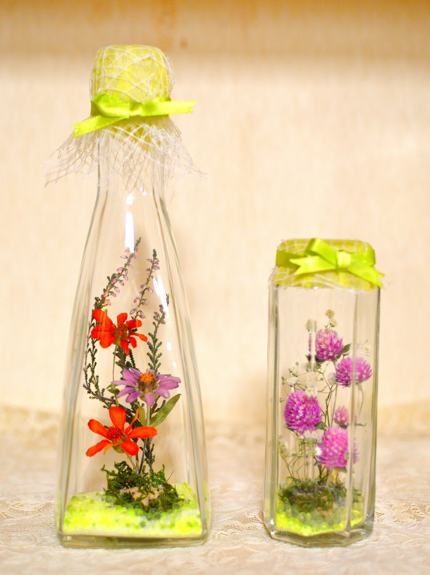 フラワーボトルの制作は、花の形を崩さないよう瓶に入れ、そこに砂状の乾燥剤を詰め、しばらく置きます。乾燥剤がゆっくりと花の水分を吸い取り、生花の質感そのままに瓶の中でドライフラワーになっていくそうです。それから、乾燥剤をしずかに取り除き、密封。「家庭で出る空き瓶で作れちゃうんですよ。お庭のお花でもできるし、作り方を覚えれば誰でも簡単に作れてしまうのが、また魅力のひとつですね。」 とても繊細で気を使う作業ですが、楽しそうな船生さんの姿が印象的です。